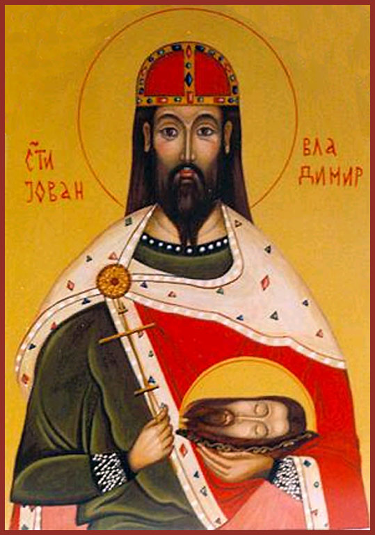 Ούτος ο εν βασιλεύσιν αγιώτατος Ιωάννης εκατάγετο από ένα χωρίον της Βουλγαρίας, καλούμενον Βλαδίμηρον, από το οποίον έλαβε και την επωνυμίαν, να καλήται Βλαδίμηρος, υιός πατρός μεν Νεεμάν του εκ Συμεών του πρώτου βασιλέως των εν τη Βουλγαρία Αχριδών γεννηθέντος, μητρός δε Άννης, της εκ Ρωμαίων καταγομένης, ακμάσας κατά τους χρόνους του Μακεδόνος Βασιλείου, εν έτει ωξη’ [868]. Παιδιόθεν δε ο Άγιος ούτος έλαμπε με αρετάς και χάριτας, και ήτον σκεύος καθαρόν του Αγίου Πνεύματος, παιδαγωγηθείς από τον θαυμαστόν Νικόλαον τον τότε όντα Επίσκοπον Αχριδών. Αφ’ ου δε έφθασεν εις ηλικίαν, υπάνδρευσαν αυτόν οι γονείς του με την θυγατέρα του βασιλέως Σαμουήλ, εφύλαξεν όμως παρθενίαν ο τρισμακάριστος, και εκαταγίνετο εις θεάρεστα έργα. Αφ’ ου δε απέθανον οι γονείς του, κατεστάθη ο Άγιος αυτεξούσιος των Τριβαλλών, ήτοι των Σέρβων βασιλεύς. Όθεν εκατάστησε κήρυκας και διδασκάλους, δια να διδάσκουν και να επιστρέφουν εις την πίστιν του Χριστού τον υποκείμενον λαόν του. Είτα έκτισε Μοναστήρια και Εκκλησίας, ξενοδοχεία τε και νοσοκομεία, και κόπτωντας τον δρυμώνα και το πυκνότατον δάσος, οπού ευρίσκετο εις τον τόπον εκείνον, έκτισε ξεχωριστόν και εξαίρετον Ναόν εις τον τρισυπόστατον Θεόν. Έκτισε δε αυτόν με τοιούτον τρόπον. Μίαν ημέραν εκαβαλίκευσε μαζί με τρεις μεγιστάνας της βασιλείας, και ευγήκε δια να κυνηγήση. Κυνηγώντας όμως, εκυνηγήθη από τον Θεόν, ως άλλος Ευστάθιος, ή μάλλον ειπείν, ως άλλος μέγας Κωνσταντίνος ουρανόθεν ωδηγήθη. Κυνηγώντας γαρ εις το δάσος, βλέπει ένα ηλιόμορφον αετόν, ο οποίος είχεν επάνω εις τον λαιμόν του ένα σταυρόν υπέρλαμπρον. Τρέχωντας δε δια να τον φθάση, εμβήκε μέσα εις το δάσος. Τότε ο αετός εστάθη. Όστις δεν ήτον αετός, αλλά Άγγελος Κυρίου. Ευθύς λοιπόν εκατέβη ο βασιλεύς από το άλογον, ομού με τους μεγιστάνας του και επροσκύνησε τον τίμιον Σταυρόν, και τον εν τούτω προσηλωθέντα Χριστόν. Εκεί δε εις τον τόπον επρόσταξε και έκτισαν Εκκλησίαν, εις την οποίαν επήγαινεν επτά φοραίς την ημέραν και επροσηύχετο, και την νύκτα έμενεν εκεί αγρυπνώντας.